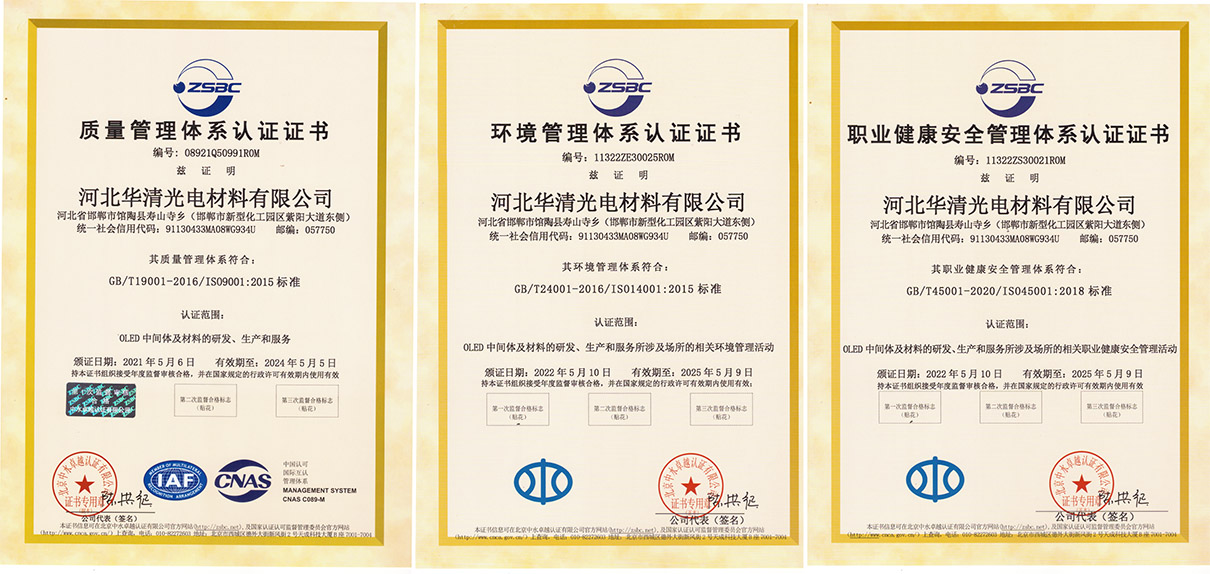 華清光電設有專門的品控部,貫徹以預防為主的風險管理理念,從原料到成品入庫,做好每一步檢測評估,并配備有先進的HPLC、GC、LCMAS、DSC、TGA、ICP-MAS等各類分析儀器,通過ISO9001、ISO14001和ISO45001體系認證。